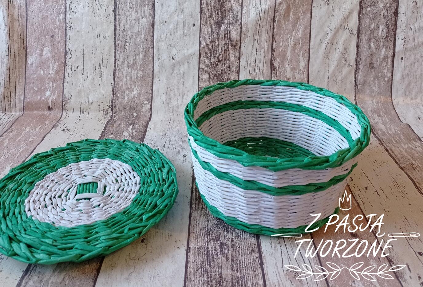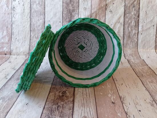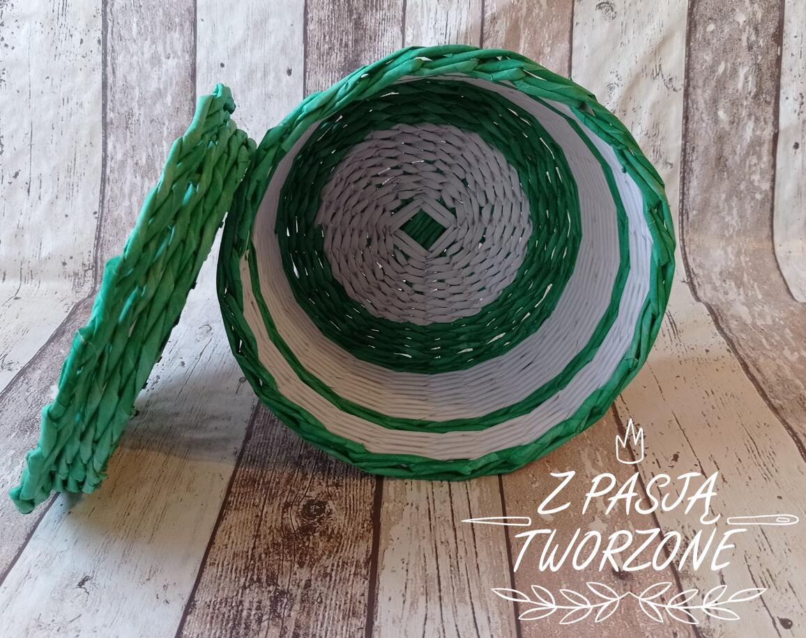 Szkatułka z pokrywką. Połączenie białego papieru ksero i zafarbowanych na zielono gazet codziennych.