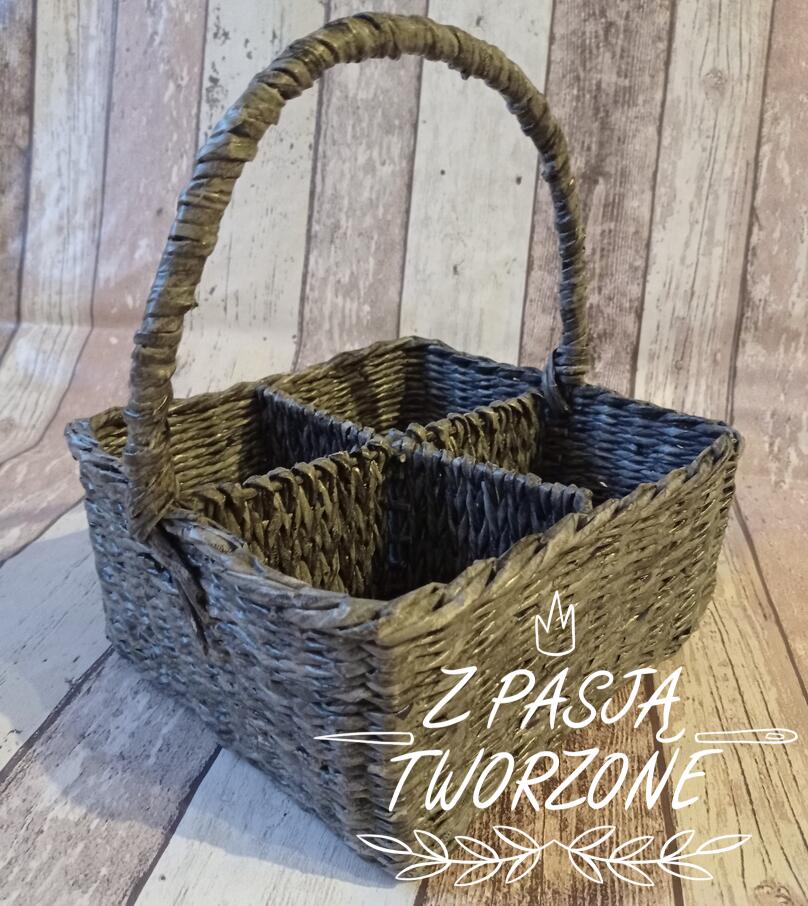 Koszyk z zafarbowanych gazet codziennych. Organizer szary z rączką.