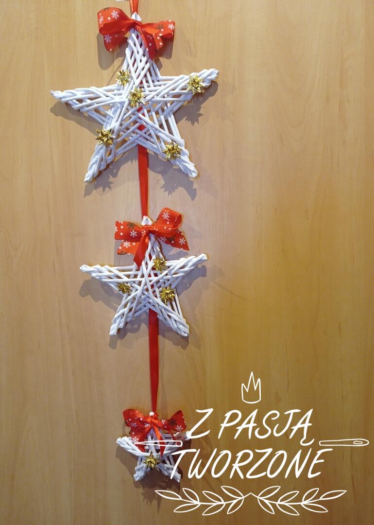 Wyplecione z białego papieru ksero gwiazdy ozdobione czerwonymi kokardami i złotymi gwiazdkami
