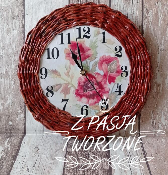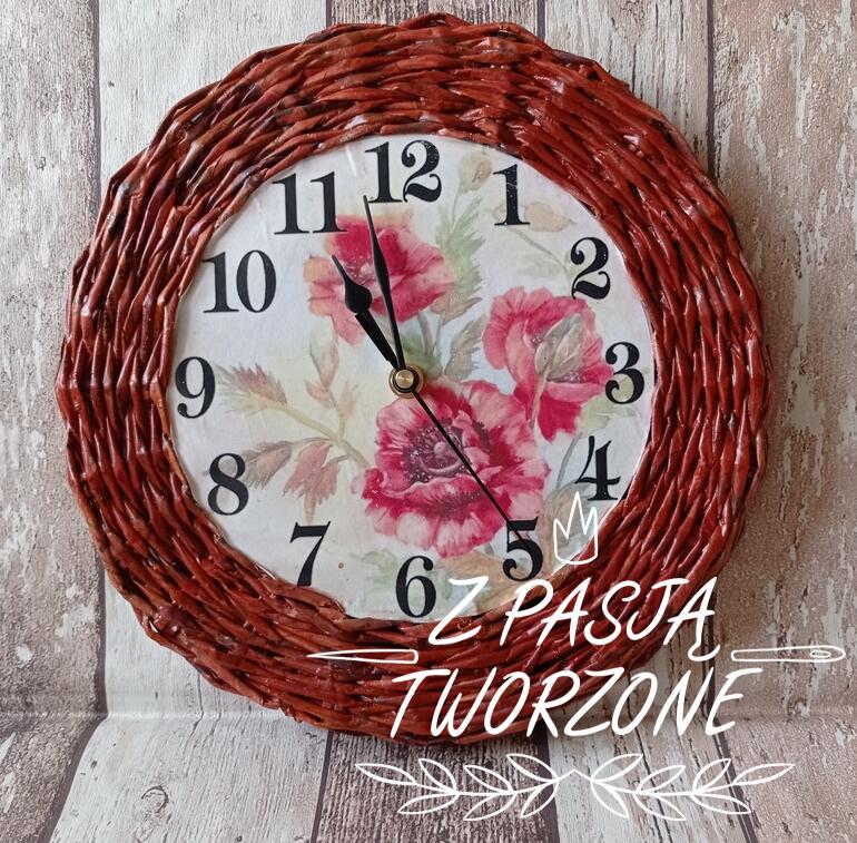 Zegar z tarczą z kwiatami opleciony papierową wikliną. Brąz.