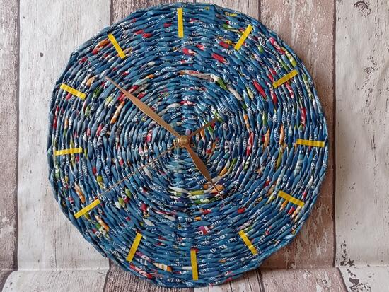 Wypleciony z dobranych kolorystycznie niebieskich rurek z progamów telewizyjnych zegar