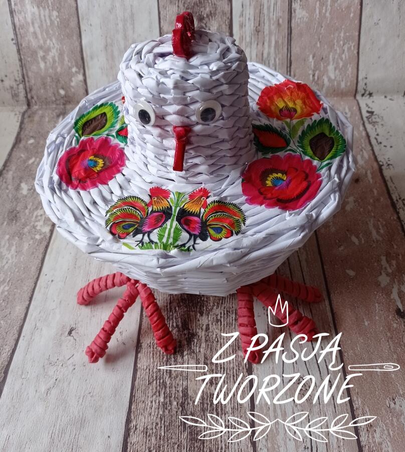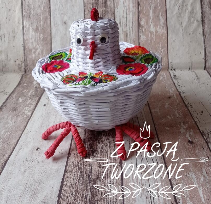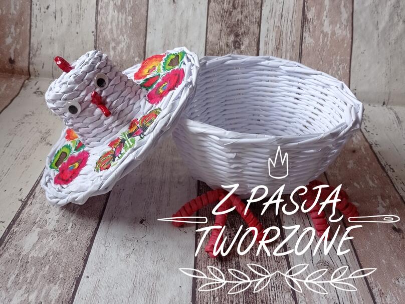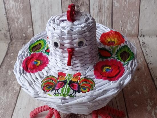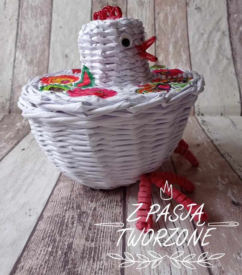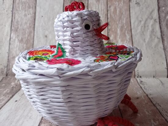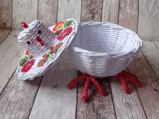 Koszyk wypleciony z papieru ksero, ozdobiony techniką decoupage. Koszyk z pokrywką w kształcie kurki