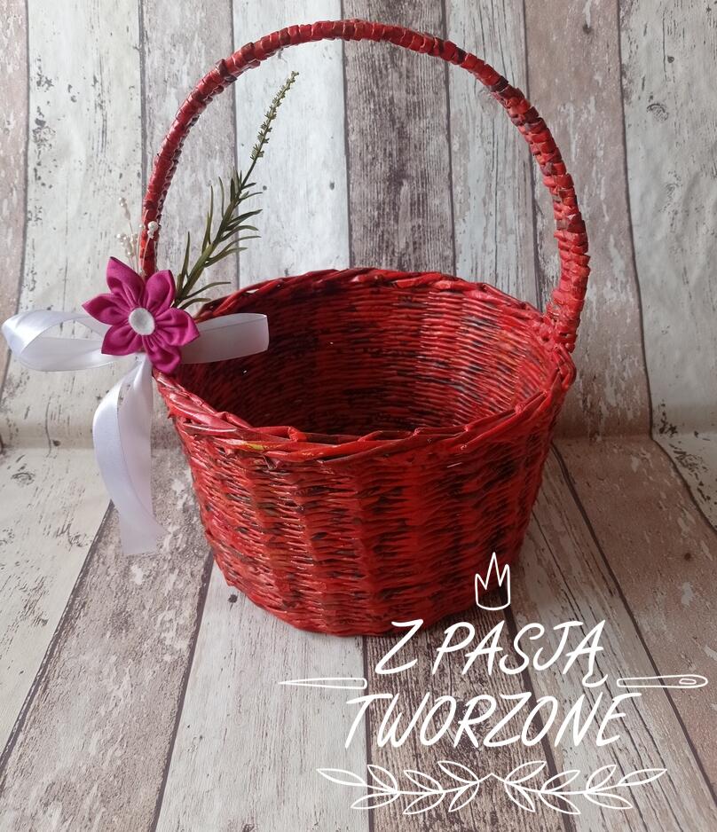 Wypleciony z papieru gazetowego koszyk, pomalowany czerwoną farbą. Przebijający druk gazetowy