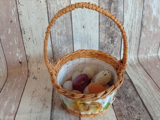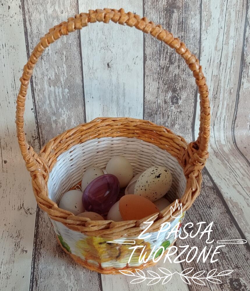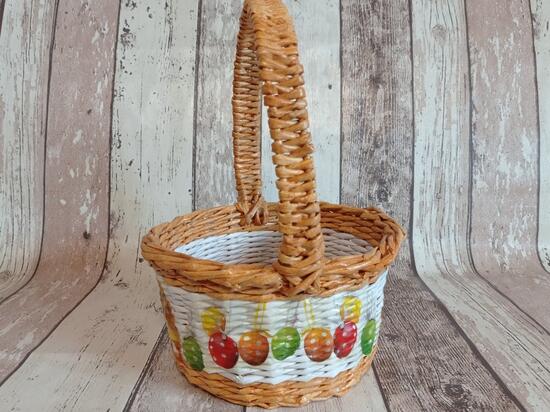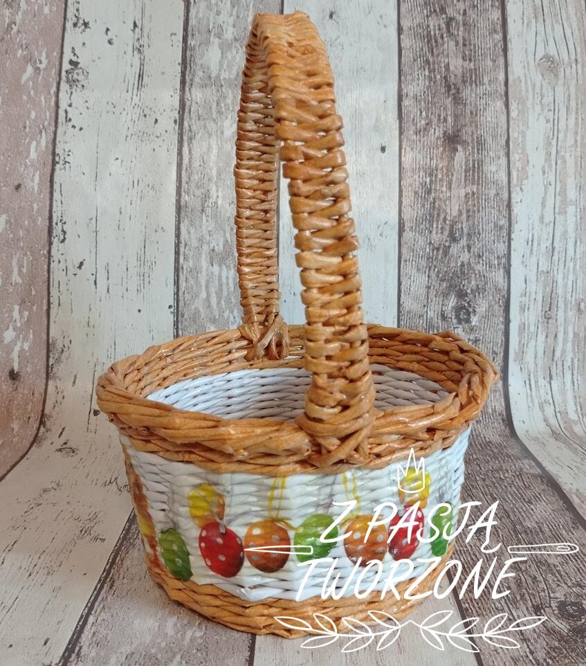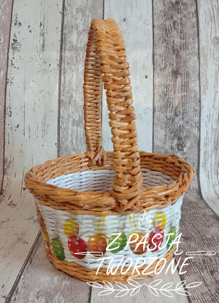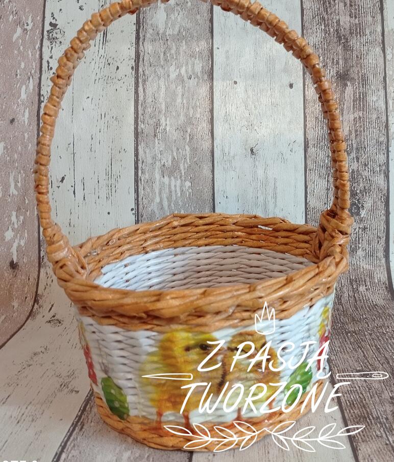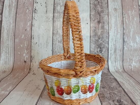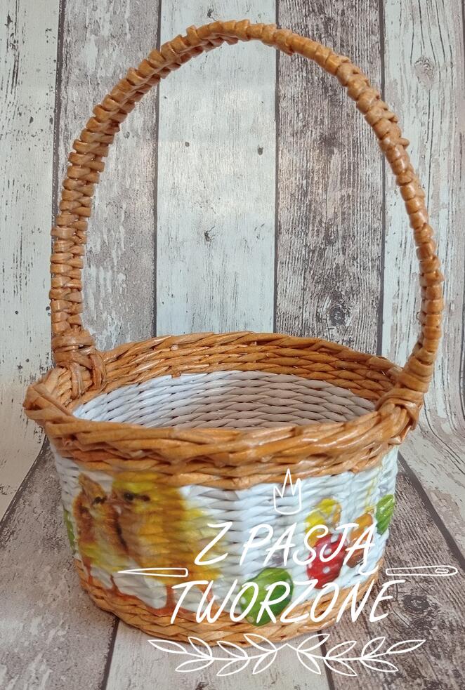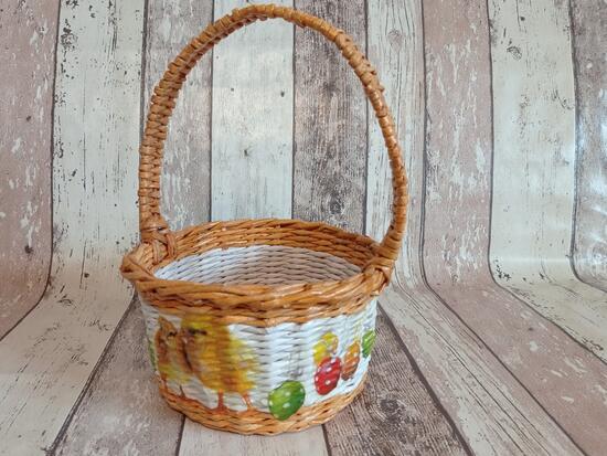 koszyczek wielkanocny. Szerokość koszyczka to 21 cm, jego wysokość to 11 cm, z rączką28 cm. Ozdobiony metodą decoupage. Utrwalony lakierem akrylowym.