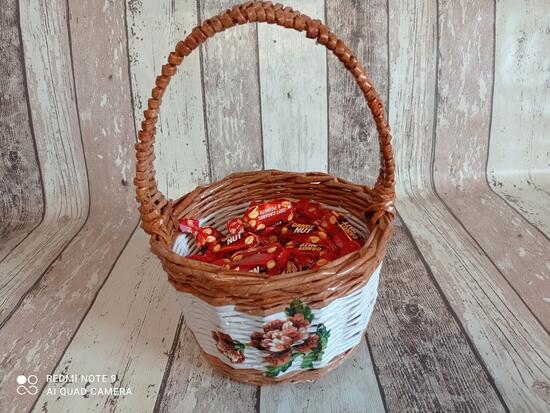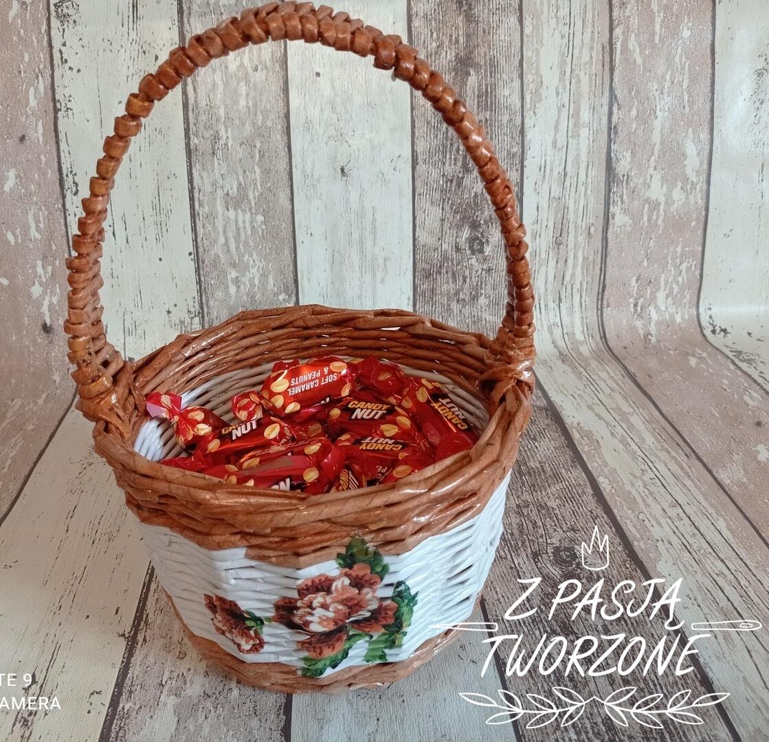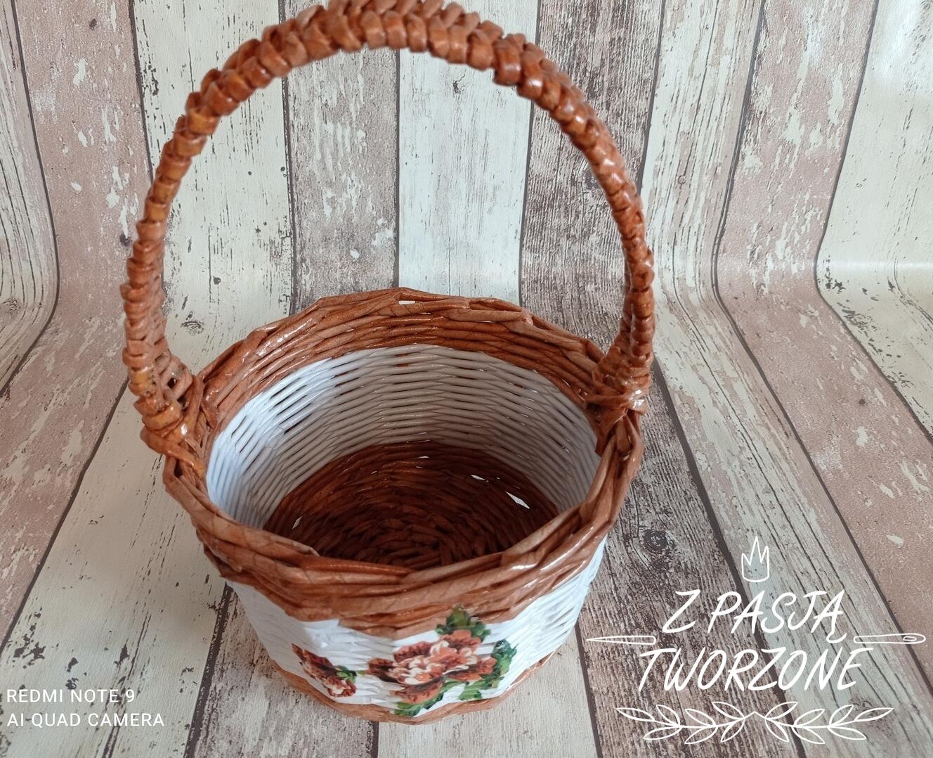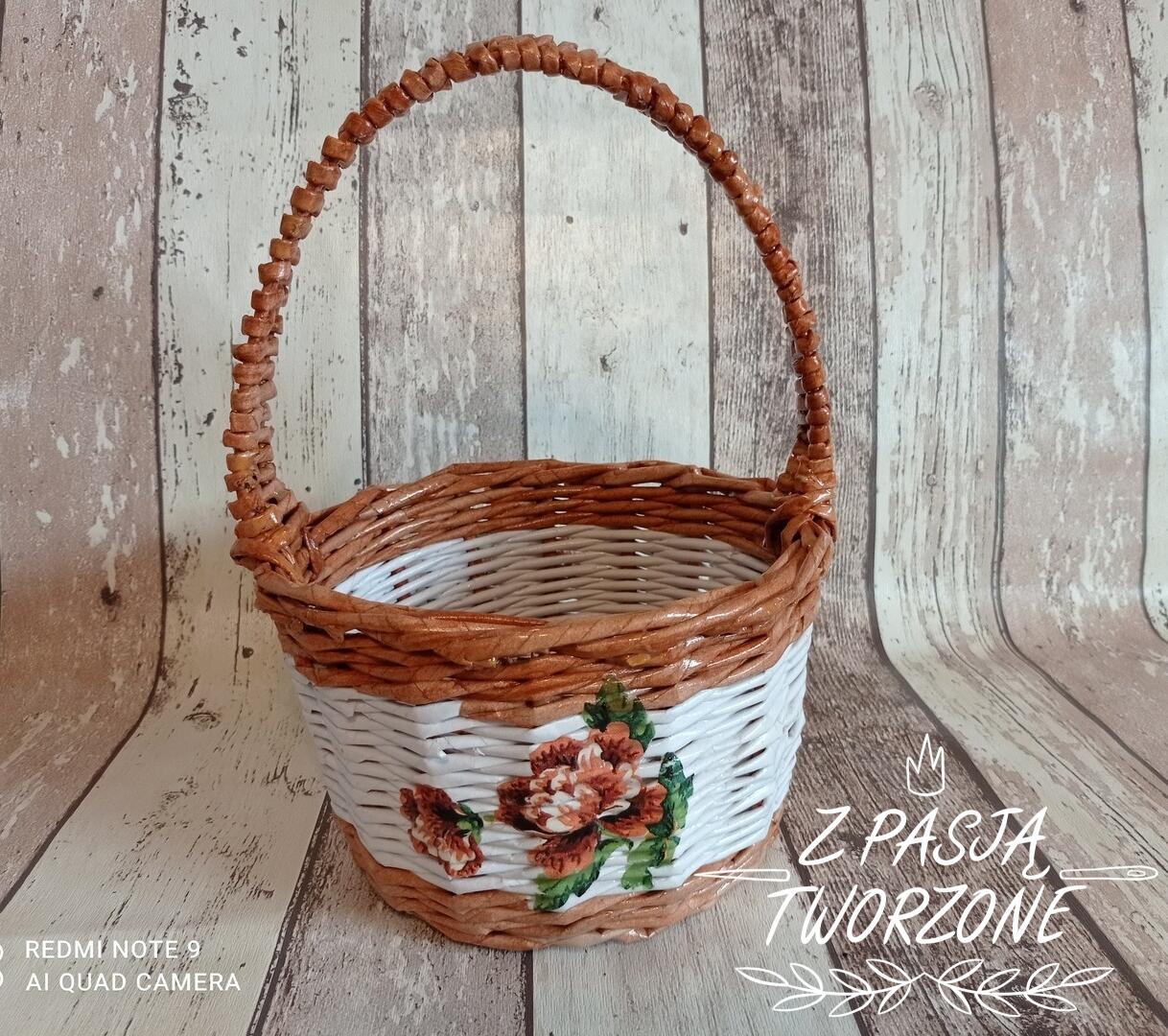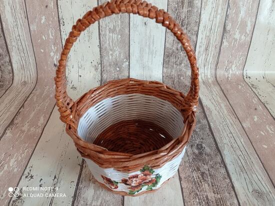 Koszyczek o szerokości22 cm, wysokości 12,5 cm, a z rączką 28 cm. Ozdobiony metodą decoupge. Utrwalony lakierem akrylowym.