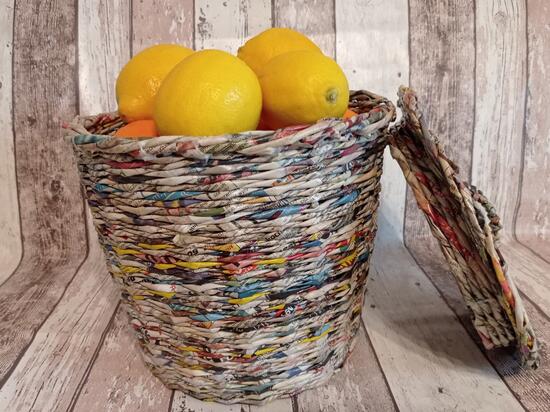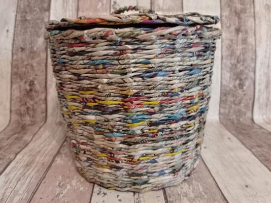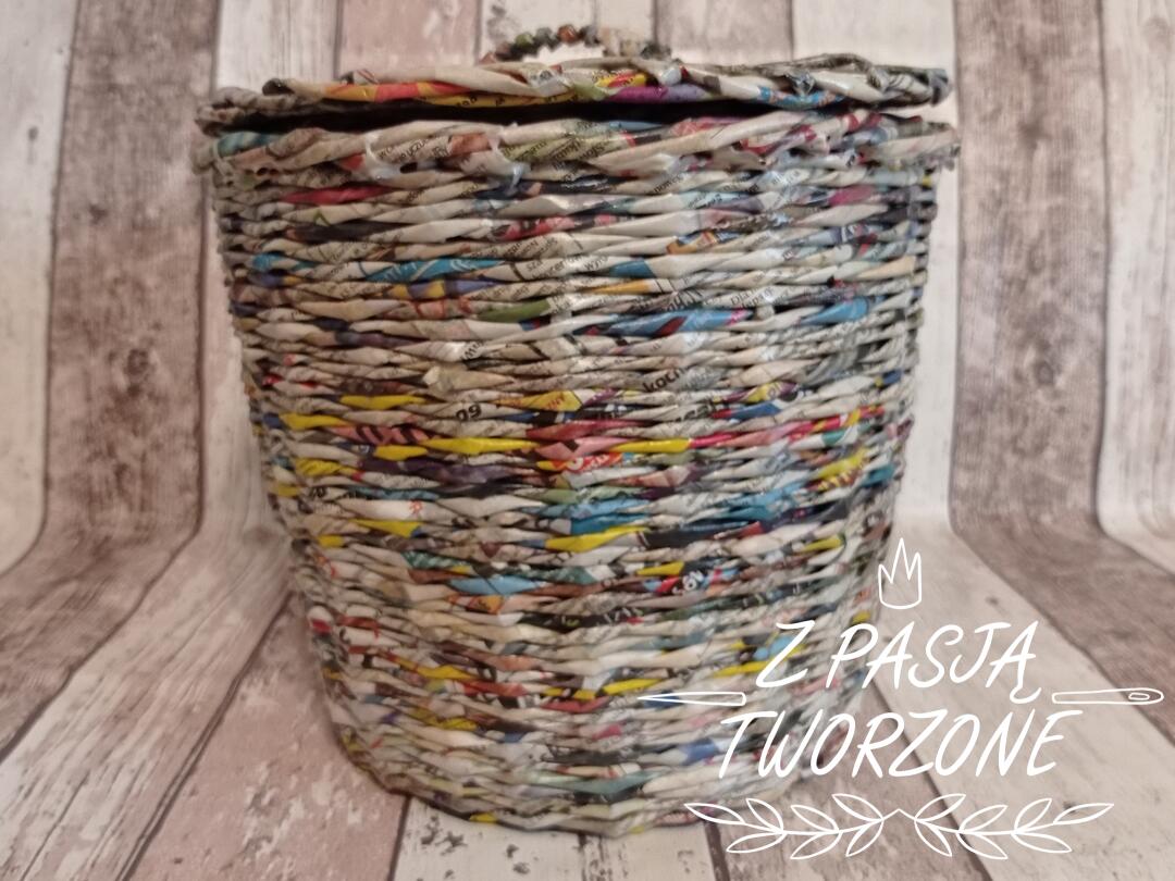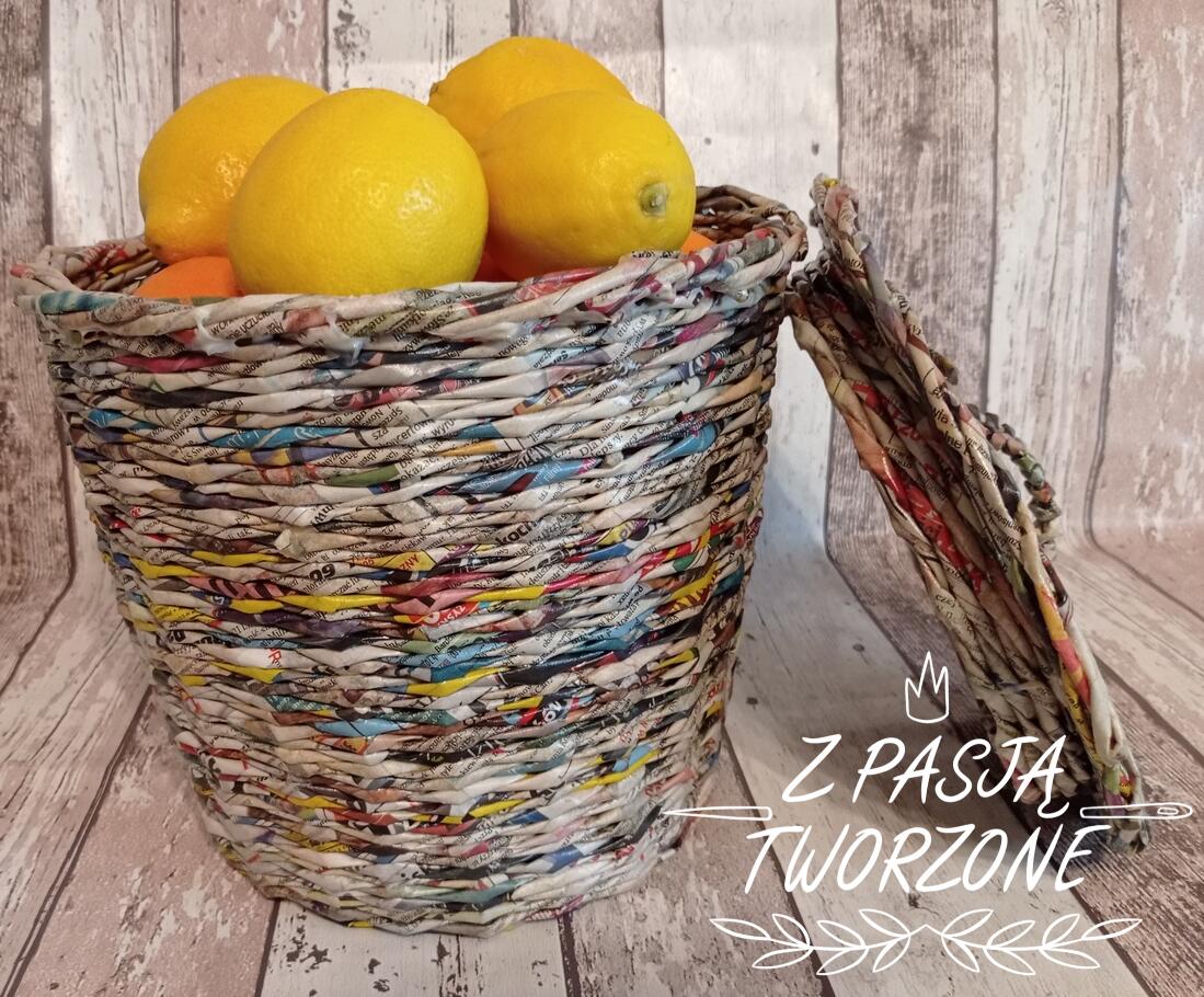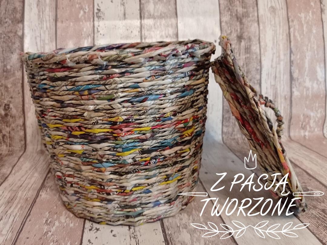 kosz wykonany z gazety codziennej. Wysokość 23 cm, z pokrywką 26,5cm.Szerokość koszyka w najszerszym miejscu to 27 cm, dno szerokości21 cm. Posiada pokrywkę. Zabezpieczony lakierem akrylowym.