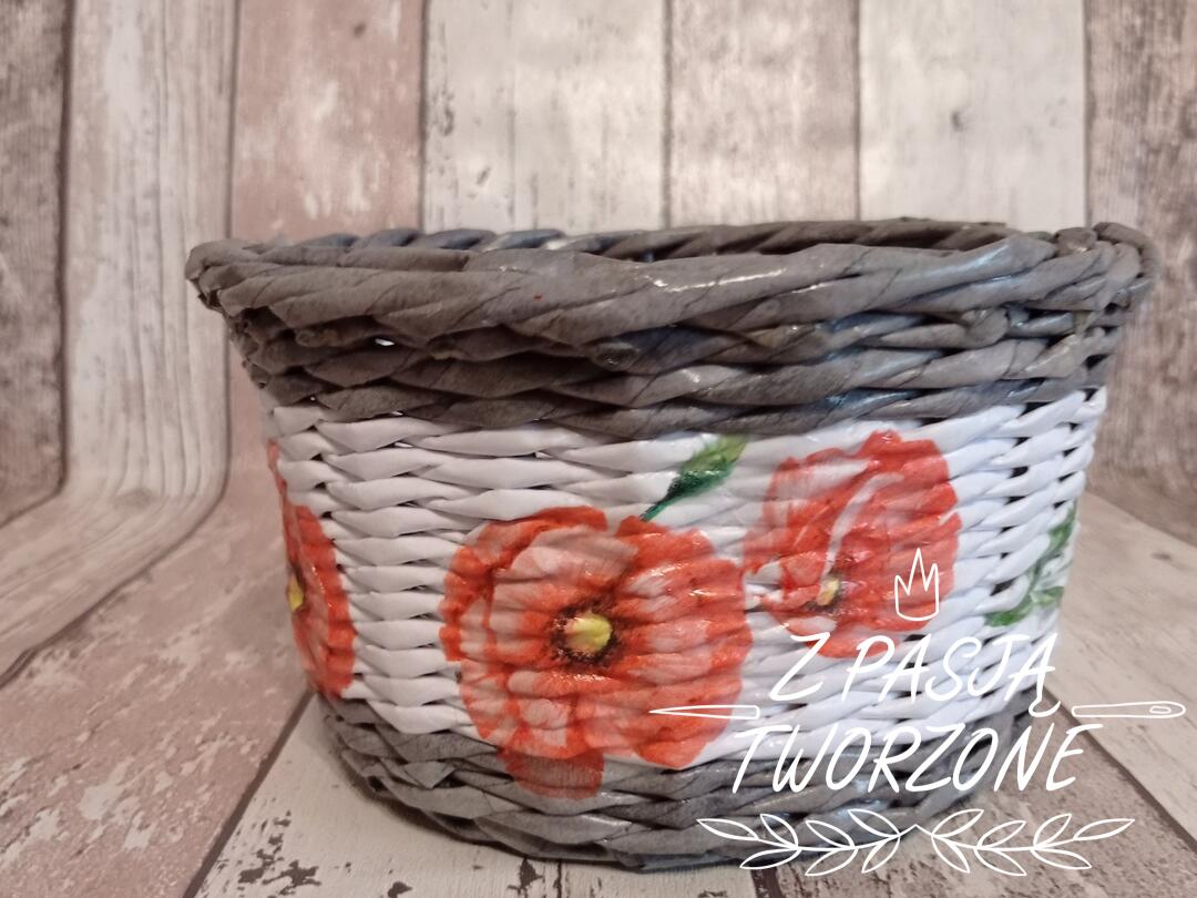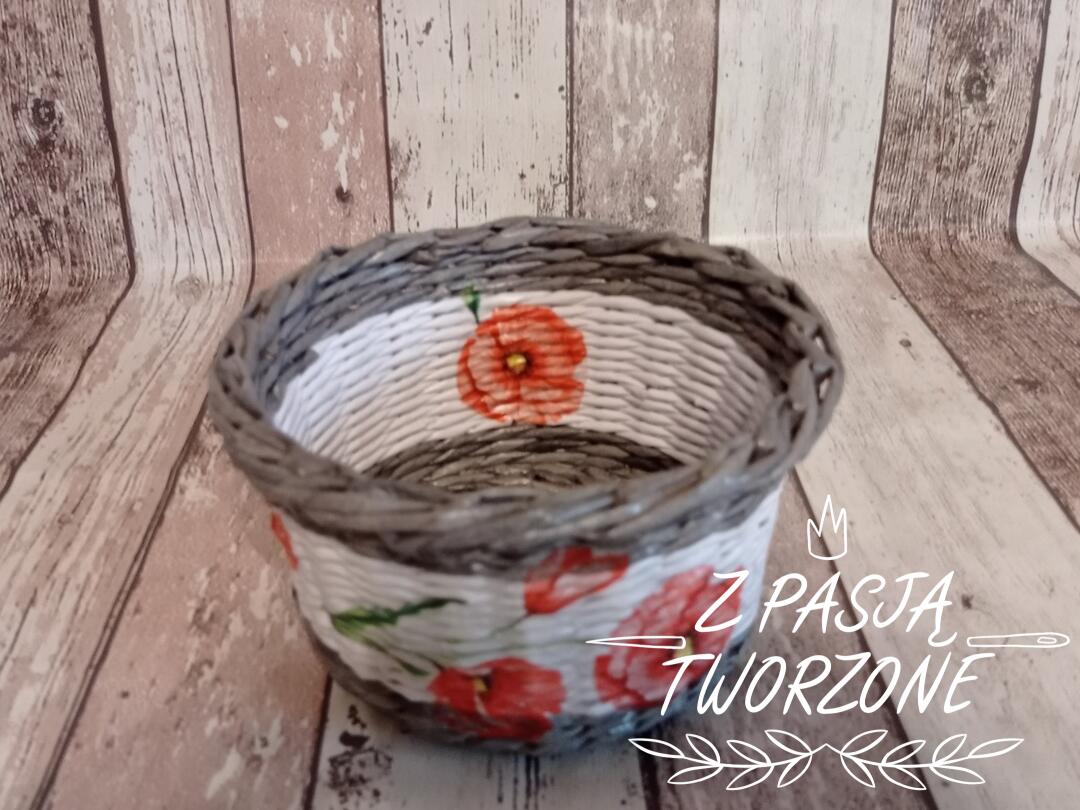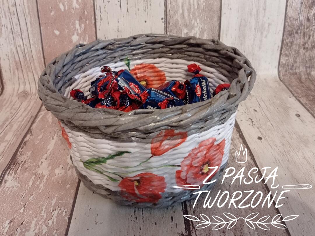 Koszyczek o wysokości 11 cm. Szerokość koszyczka to 20 cm. Szerokość dna to 16 cm. Ozdobiony metodą docoupage. Utrwalony lakierem akrylowym.
