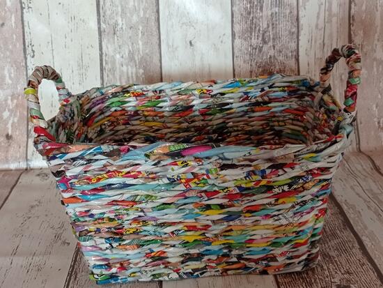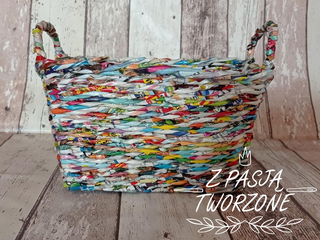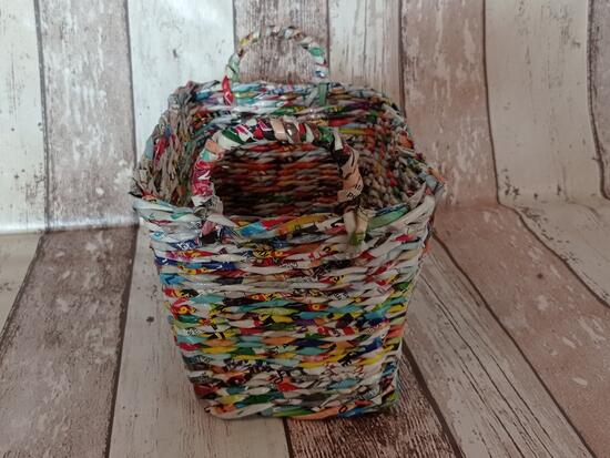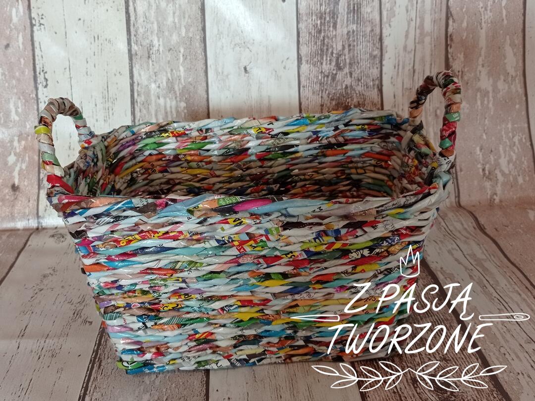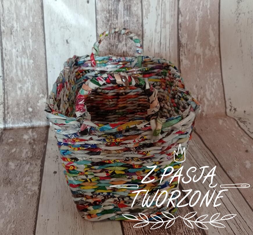 Koszyczek z papierowej wikliny. Szerokość koszyczka 16cm, długość 24cm .Wysokość koszyka 13 cm , z rączką 19 cm.. Zabezpieczony lakierem akrylowym
