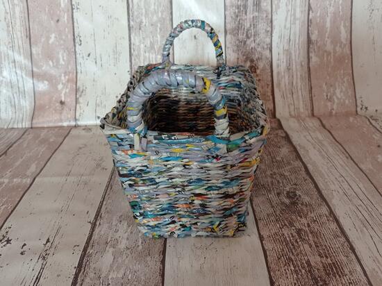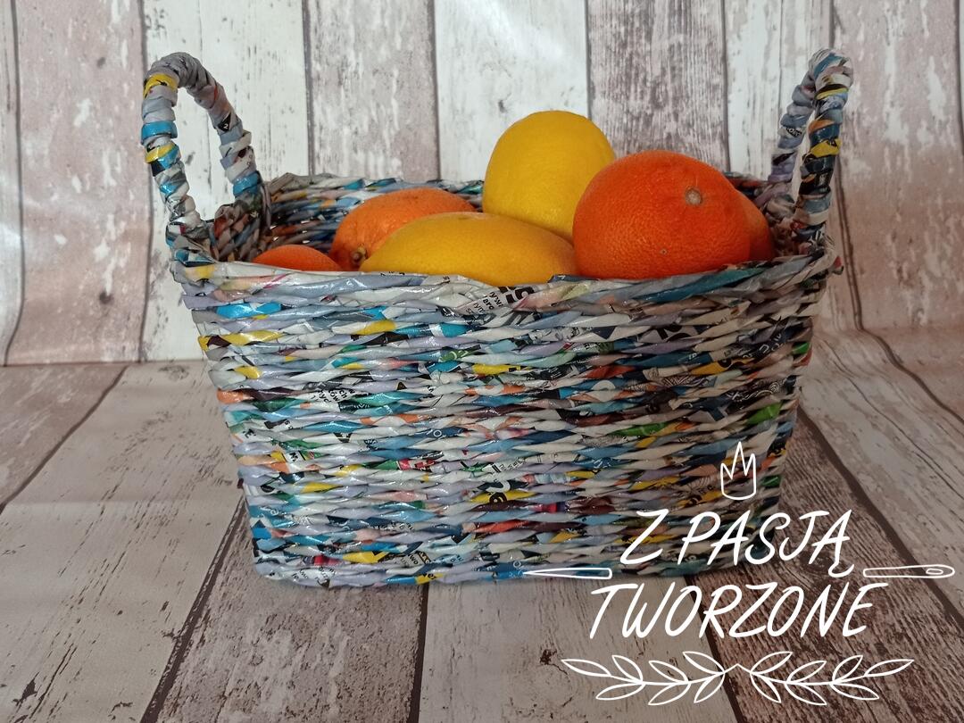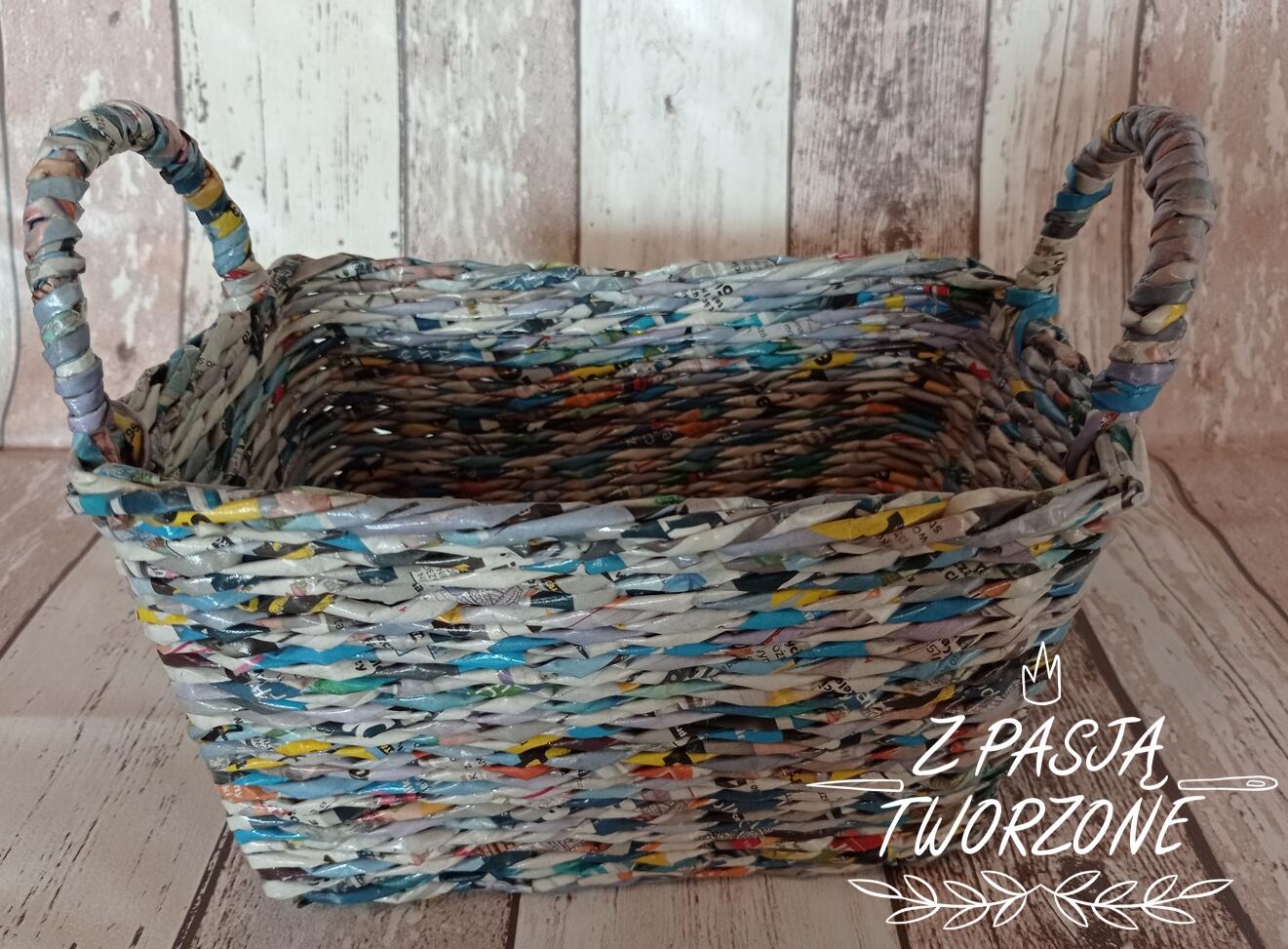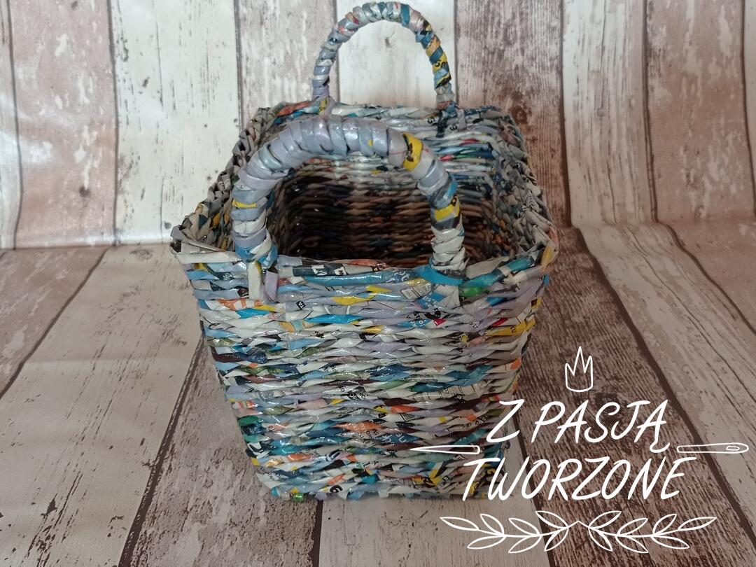 Kosz wykonany z wielokolorowych ulotek. Dobierne odcienie niebieskie. Dno w rozmiarach 12/20 cm. W najszerszym miejscu rozmiary 15,5/ 23 cm. Wysokość koszyka to 13 cm, a z uszami 19 cm.Utrwalony lakierem akrylowym.
