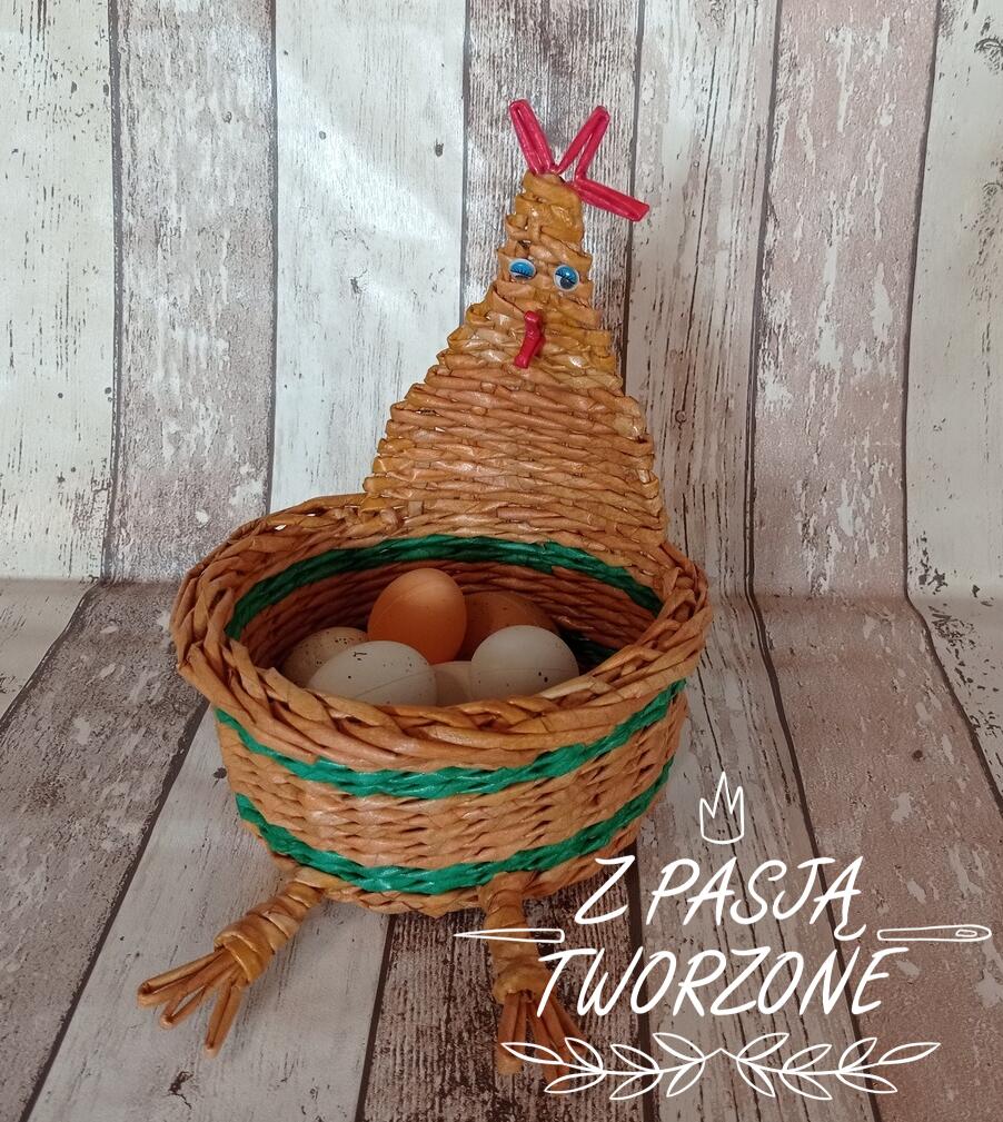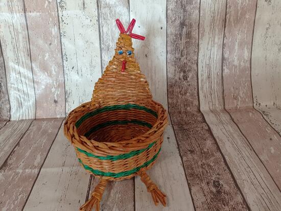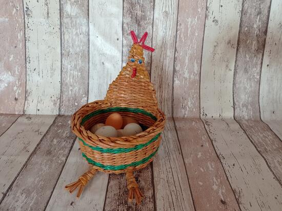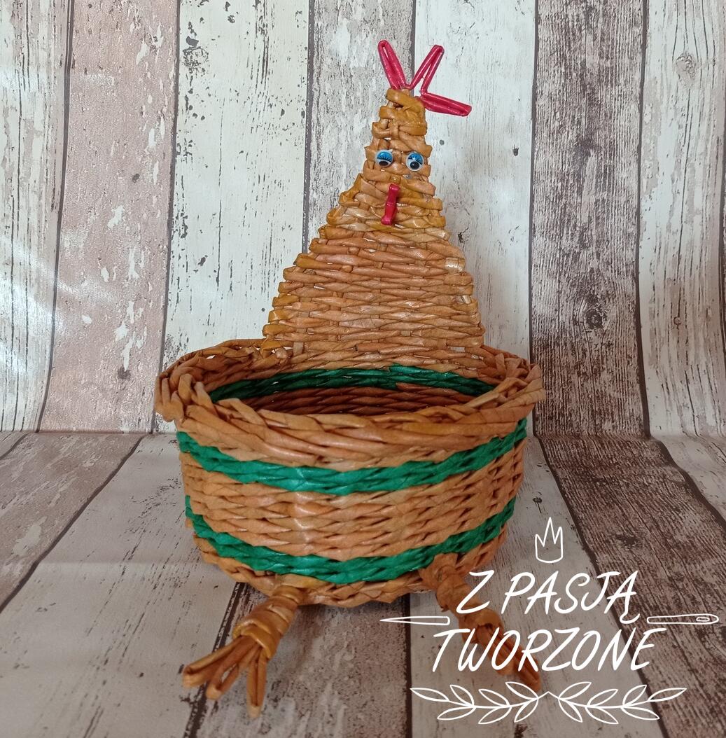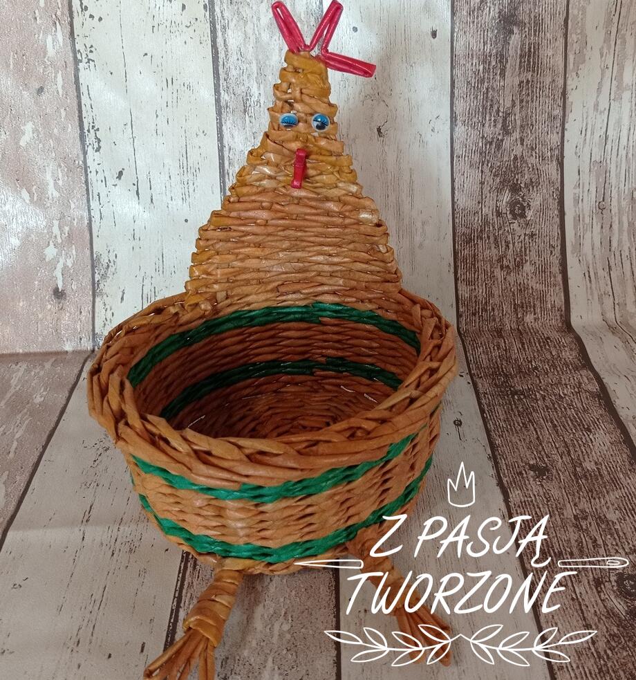 Koszyk w kształcie kurczaka. Wykonany z farbowanej gazety codziennej. szerokość koszyka to 20 cmcm. Wysokość koszyka to 10/26cm. Koszyk utrwalony lakierem bio, dopuszczony do kontaktu z żywnością.,