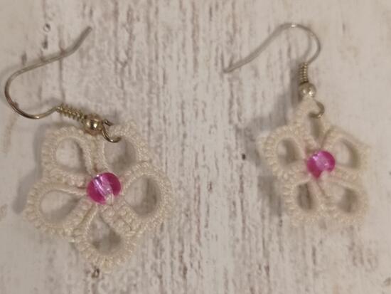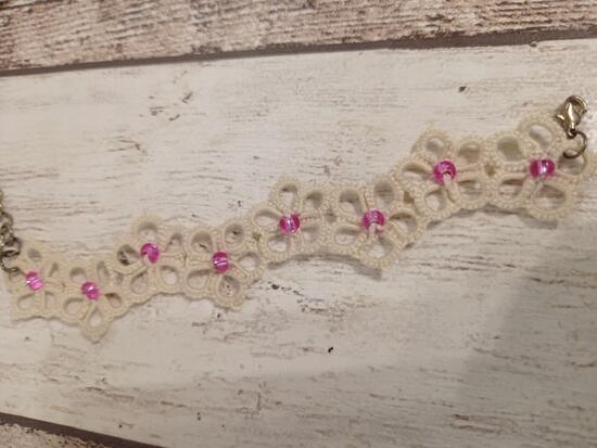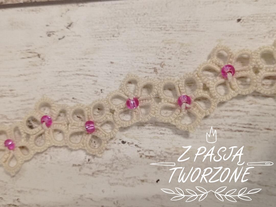 kwiatkowa bransoletka ecru z różowym koralikiem