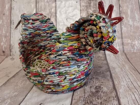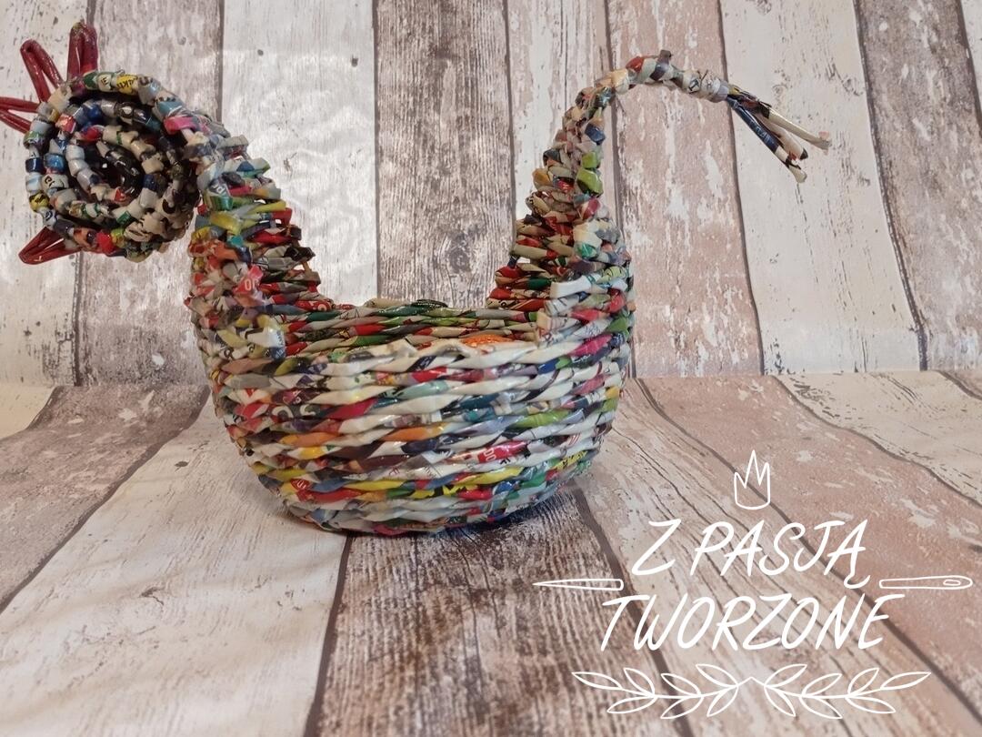 Mały koszyczek w kształcie kurki. Wykonany z kolorowych ulotek. Koszyczek o szerokości dna 10 cm i 32 cm w najszerszym miejscu. Wysokość koszyczka 7 cm, w najwyższym miejscu 19 cm. Koszyczek utrwalony lakierem akrylowym.