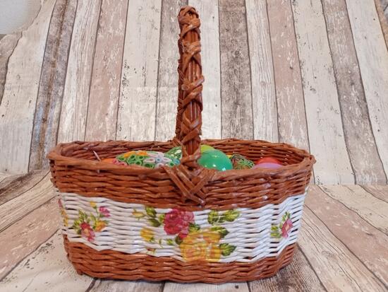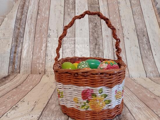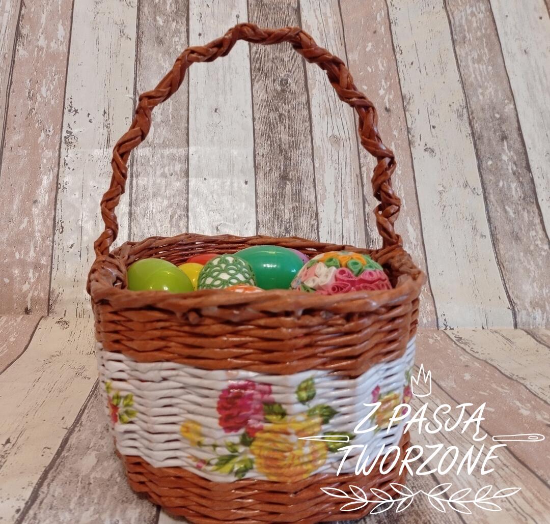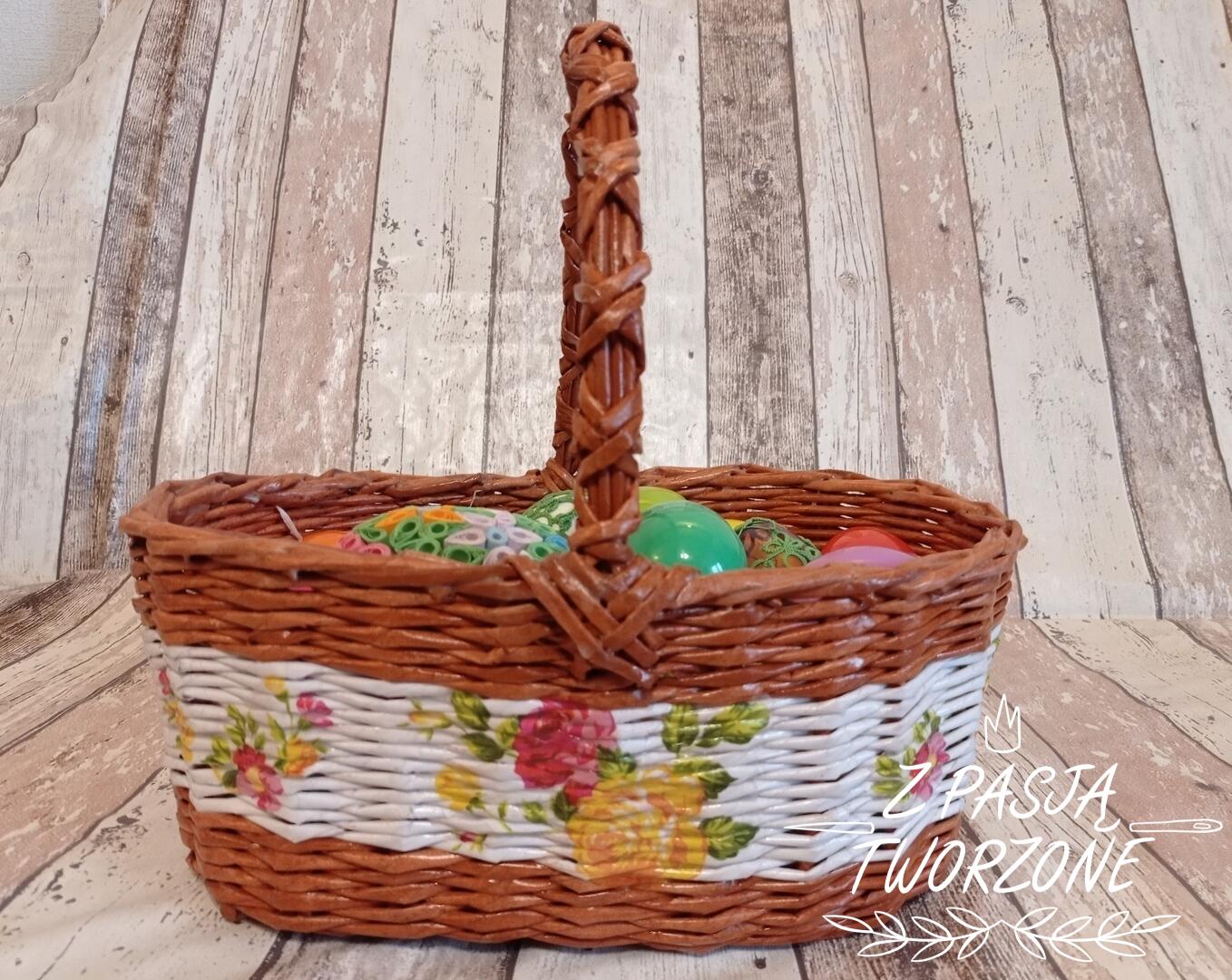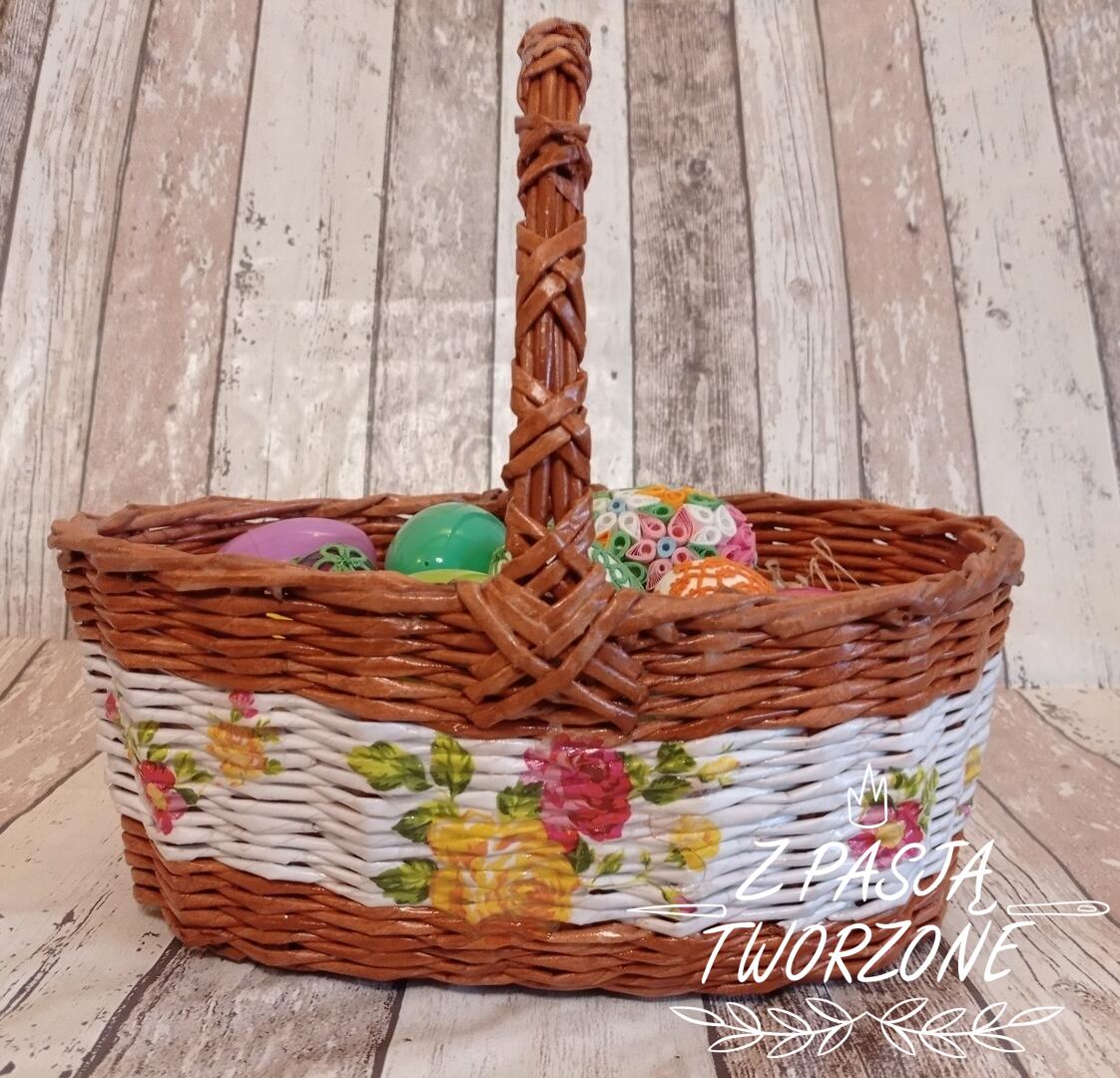 Duży koszyk wykonany z gazet codziennych i papieru ksero. Połączenie koloru brązowego i bieli. Biały pas ozdobiony techniką decoupage wzorem czerwonych i żółtych róż. Koszyczek o szerokości dna 21 cm i długości32 cm. W najszerszym miejscu ma 26 cm, w najdłuższym 36 cm. Wysokość koszyczka 14 cm, z rączką 31,5 cm. Koszyk utrwalony lakierem bio, dopuszczony do kontaktu z żywnością. (Produkt dostępny)