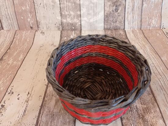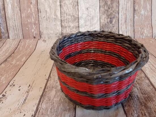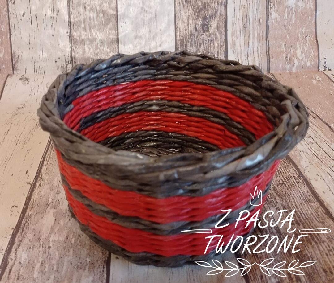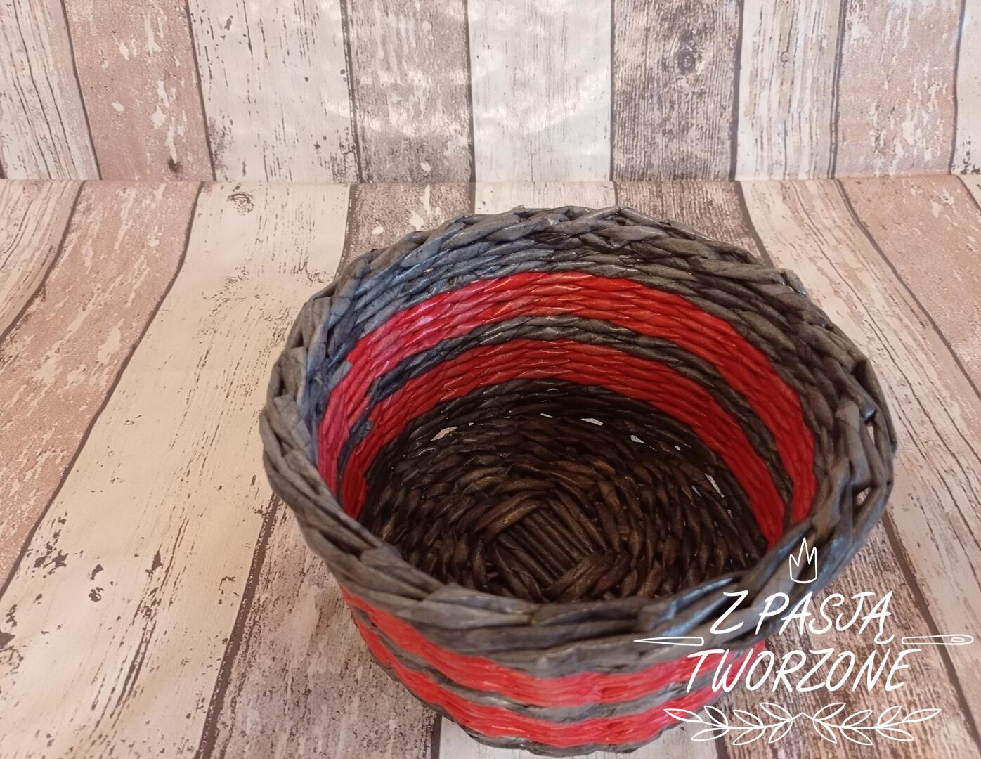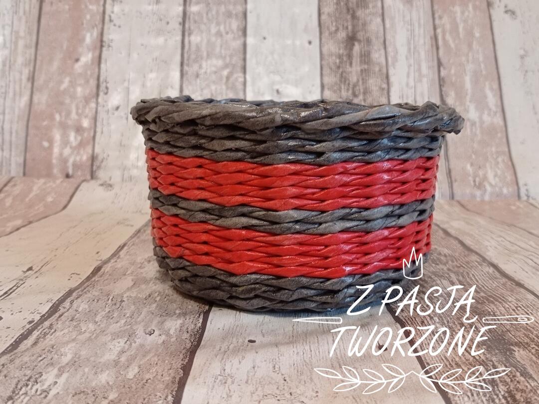 Mały koszyczek wykonany z farbowanych gazet codziennych. Połączenie ciemnego szarego koloru z czerwonymi pasami. Koszyczek o szerokości dna 16,5 cm i 20 cm w najszerszym miejscu. Wysokość koszyczka 11 cm. Koszyczek utrwalony lakierem akrylowym. (Produkt dostępny)