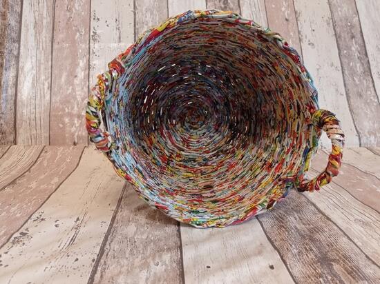 Średni koszyk wykonany z ulotek . Multicolor. Koszyczek o szerokości dna 20,5 cm i 24,5 cm w najszerszym miejscu. Wysokość koszyczka 18 cm, z uszami 22 cm. Koszyczek utrwalony lakierem akrylowym.