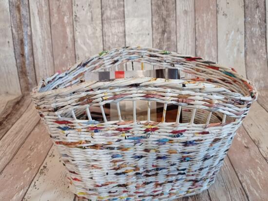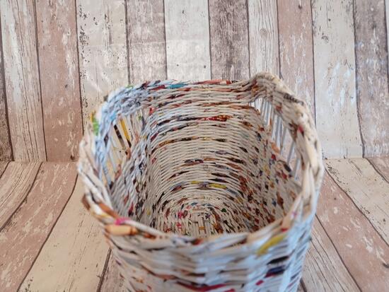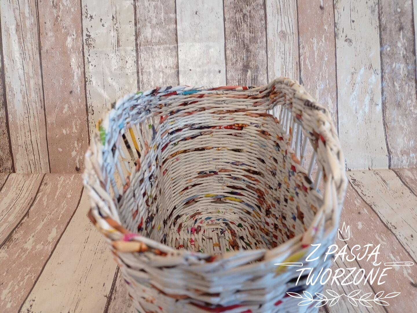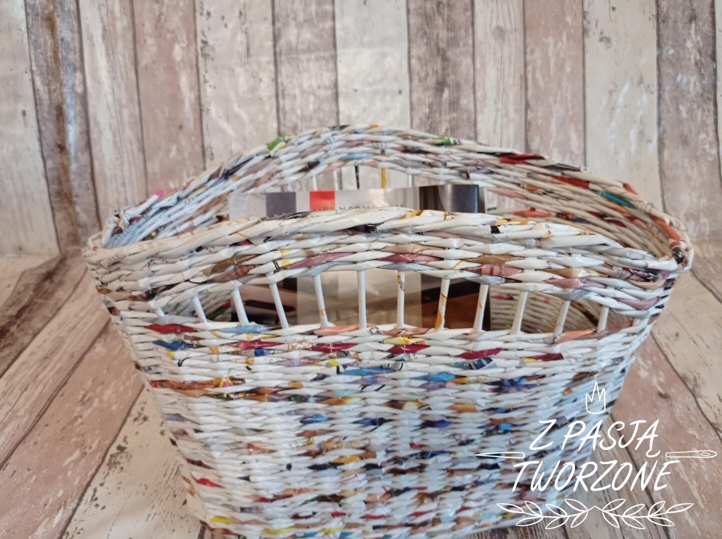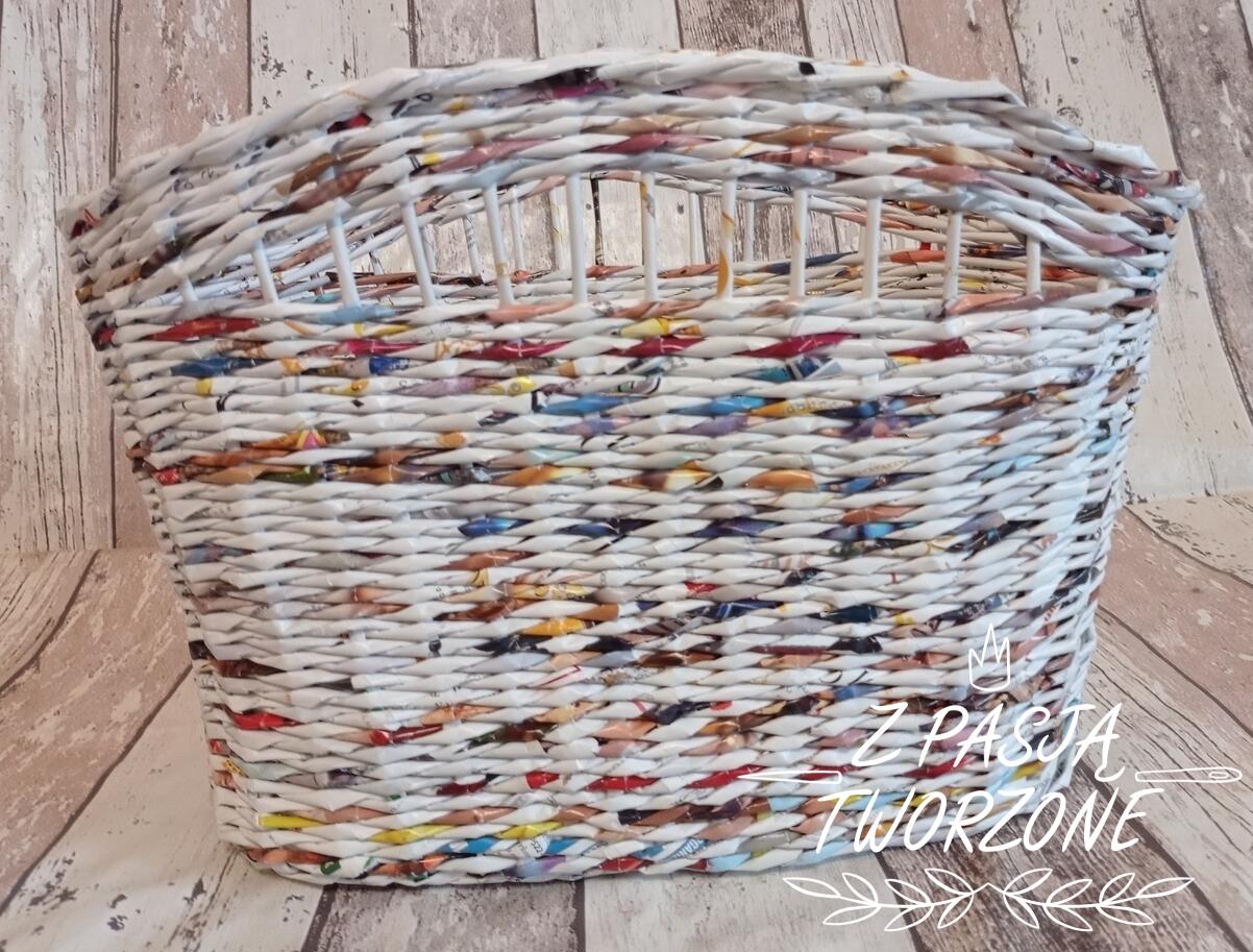 Gazetnik wykonany z gazet kolorowych, z przewagą bieli. Koszyczek o szerokości dna 16 cm i 32 cm długości. W najszerszym miejscu mierzy 19 cm, ma długość 38 cm. Wysokość koszyczka 26 cm. Koszyczek utrwalony lakierem akrylowym.