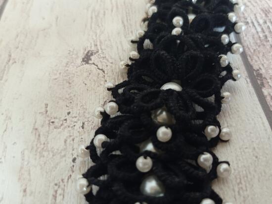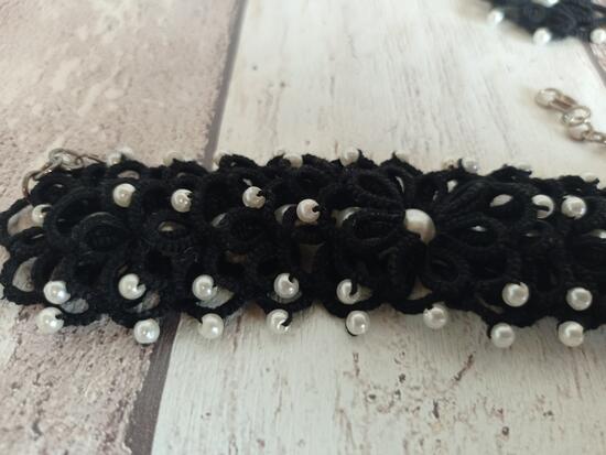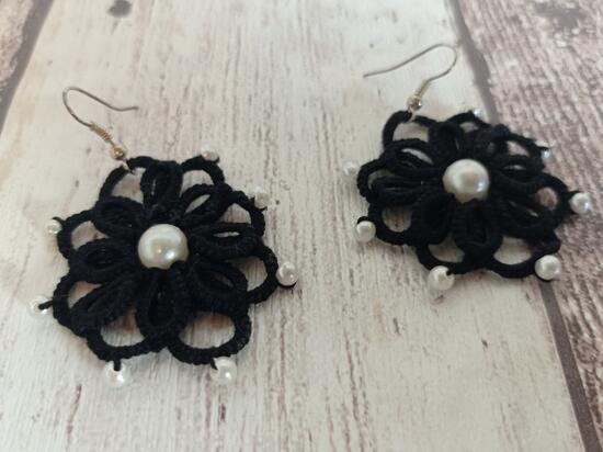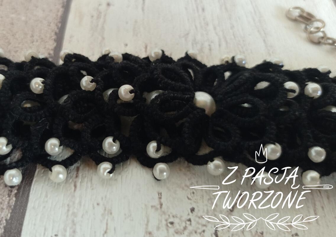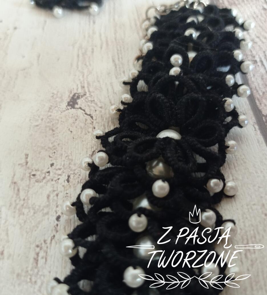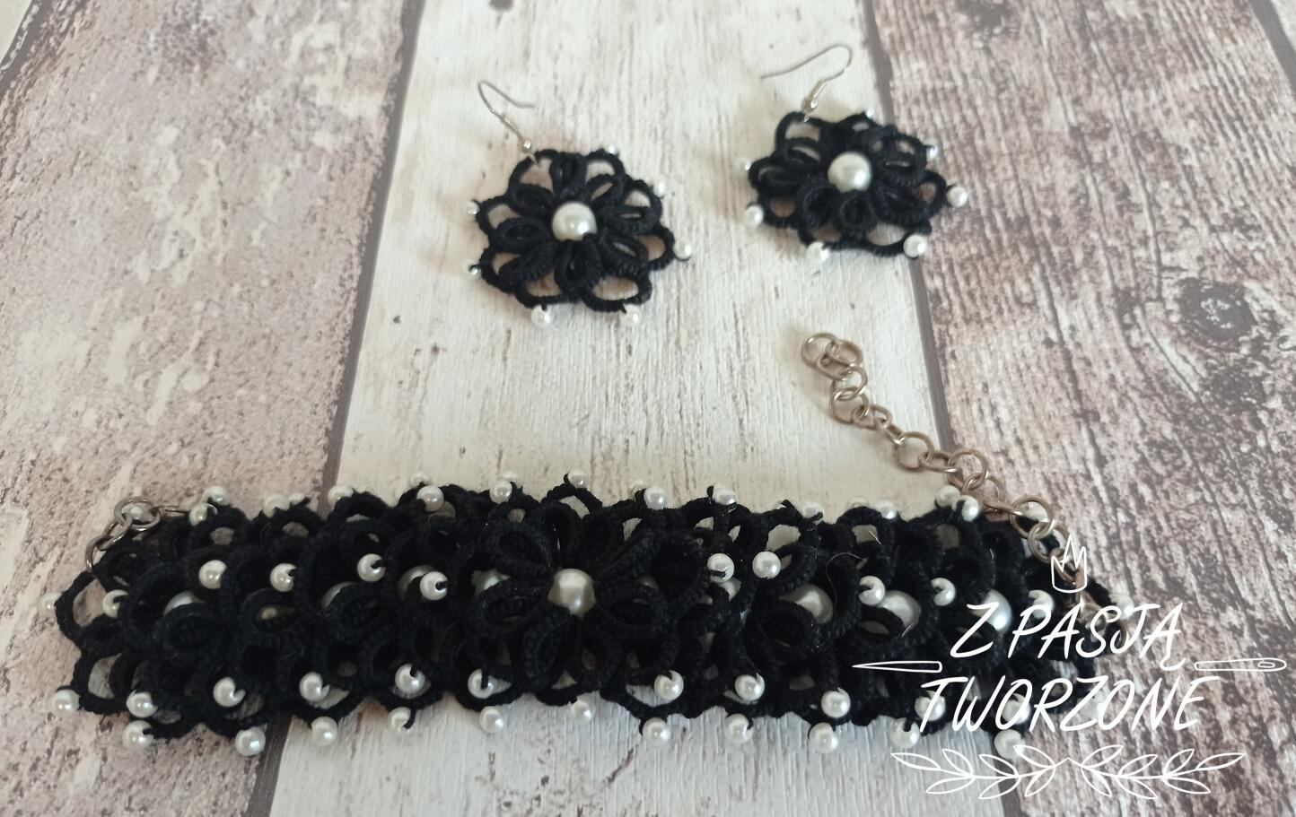 Kompletwykonany techniką frywolitki (koronka dworska). komplet bransoletka i kolczyki warstwowe, z białymi koralikami