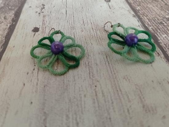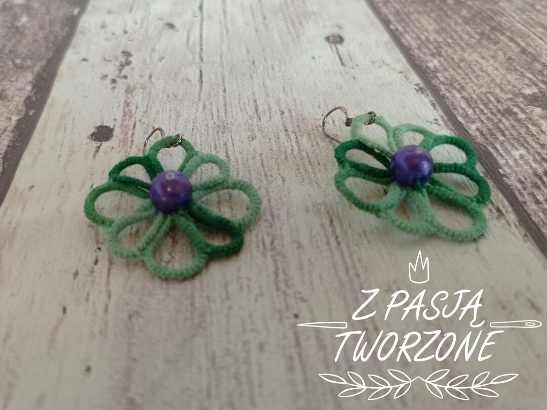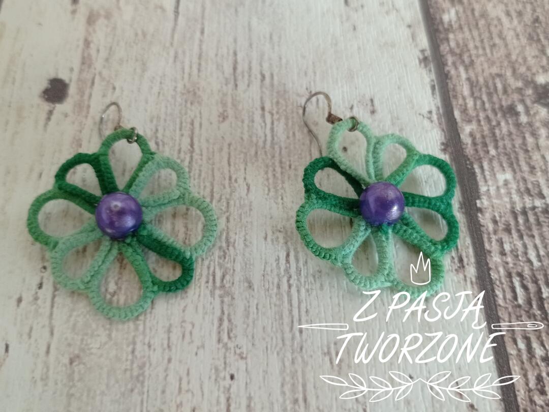 kolczyki zielone cieniowane kwiaty z fioletowym koralikiem