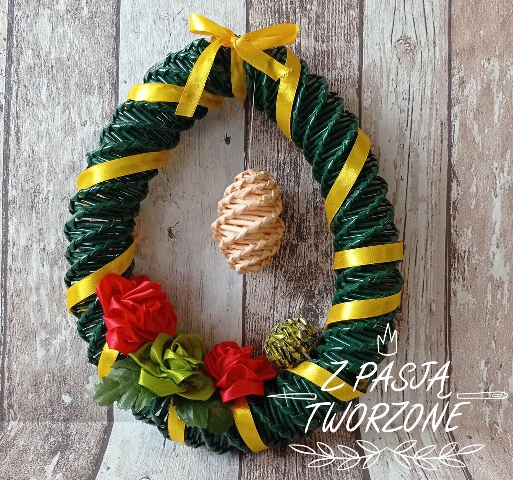 Wielkanocny wieniec z papierowej wikliny. Kwiaty wykonane ze wstążki