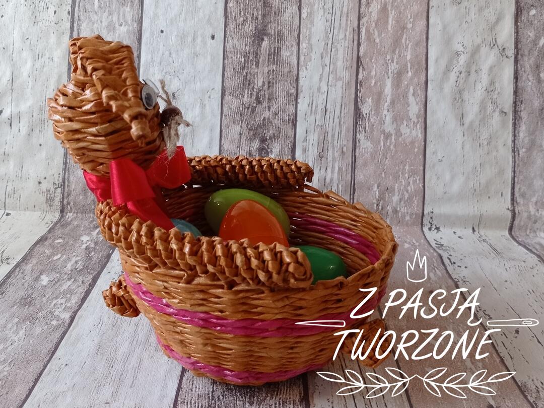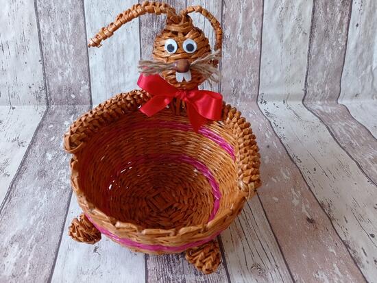 Koszyk królik wykonany z farbowanej gazety codziennej.